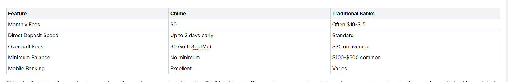 Many people want to know how Chime stacks up against traditional banks. Here’s a side-by-side look: